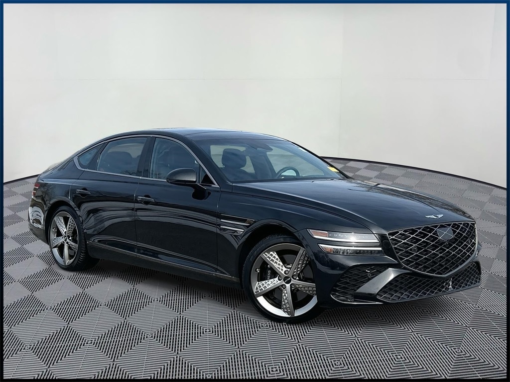 The full list of features includes: Option Group 01, Genesis Certified Certified, 18 Speakers, 4-Wheel Disc Brakes, ABS brakes, Adaptive suspension, Air Conditioning, Alloy wheels, AM/FM radio: SiriusXM, Android Auto & Apple CarPlay, Anti-whiplash front head restraints, Auto High-beam Headlights, Auto tilt-away steering wheel, Auto-dimming door mirrors, Auto-dimming Rear-View mirror, Automatic temperature control, Bumpers: body-color, Compass, Delay-off headlights, Driver door bin, Driver vanity mirror, Dual front impact airbags, Dual front side impact airbags, Electronic Stability Control, Emergency communication system: Genesis Connected Services, Exterior Parking Camera Rear, Four wheel independent suspension, Front anti-roll bar, Front Bucket Seats, Front Center Armrest, Front dual zone A/C, Front reading lights, Fully automatic headlights, Garage door transmitter: HomeLink, Heated and Ventilated Front Bucket Seats, Heated door mirrors, Heated front seats, Heated rear seats, Heated steering wheel, Illuminated entry, Knee airbag, Leather Seating Surfaces, Leather steering wheel, Low tire pressure warning, Memory seat, Navigation System, NFC Key Card, Occupant sensing airbag, Outside temperature display, Overhead airbag, Overhead console, Panic alarm, Passenger door bin, Passenger vanity mirror, Power door mirrors, Power driver seat, Power moonroof, Power passenger seat, Power steering, Power windows, Radio data system, Radio: AM/FM/HD/SiriusXM Bang & Olufsen Audio System, Rain sensing wipers, Rear air conditioning, Rear anti-roll bar, Rear reading lights, Rear seat center armrest, Rear side impact airbag, Rear window defroster, Remote keyless entry, Roadside Assistance Kit, Security system, Speed control, Speed-sensing steering, Speed-Sensitive Wipers, Steering wheel memory, Steering wheel mounted audio controls, Tachometer, Telescoping steering wheel, Tilt steering wheel, Traction control, Trip computer, Turn signal indicator mirrors, Variably intermittent wipers, Ventilated front seats, Wheel Locks, and Wheels: 20" x 8.5J Front and 20" x 9.5J Rear Sport Alloy.