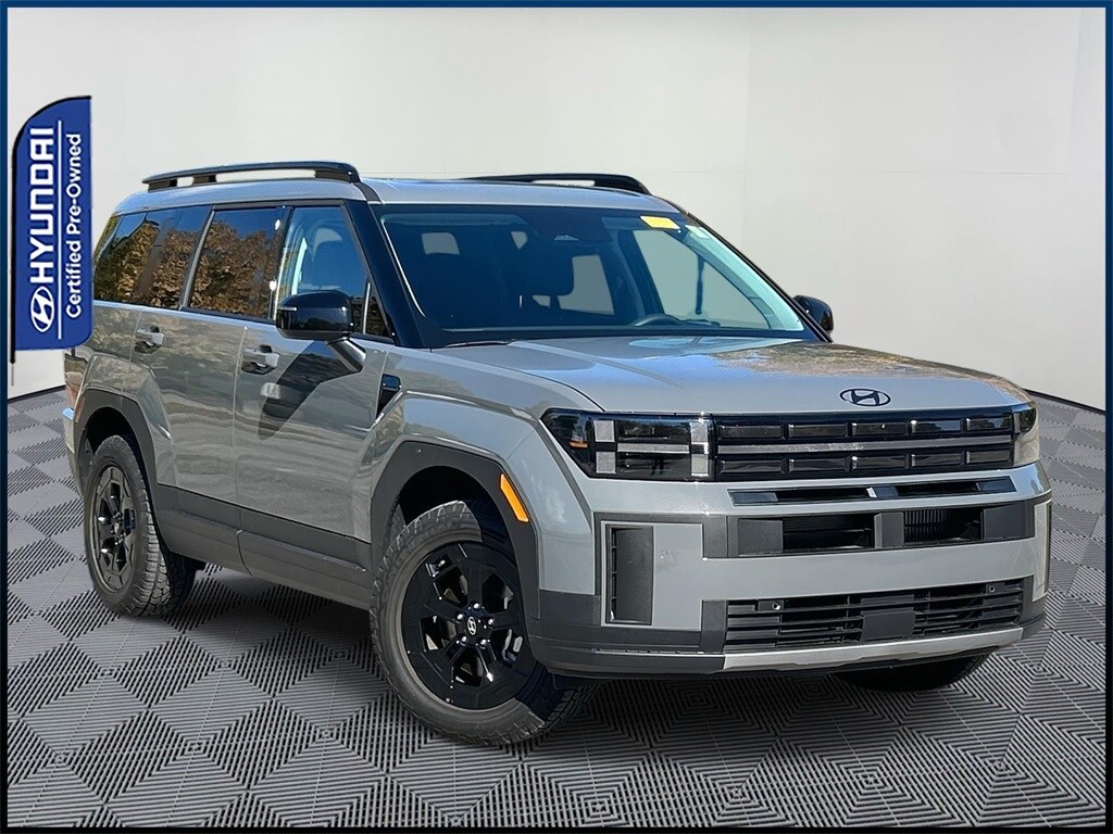 The full list of features includes: Option Group 01, Tow & Go Package (Ball Mount Kit and Tow Hitch), Hyundai Combined Certified, AWD, Black Premium Synthetic, 3rd row seats: bench, 4-Wheel Disc Brakes, 6 Speakers, ABS brakes, Air Conditioning, Alloy wheels, AM/FM radio: SiriusXM, Apple CarPlay & Android Auto, Auto High-beam Headlights, Automatic temperature control, Brake assist, Bumpers: body-color, Cargo Cover, Cargo Net, Cargo Tray, Carpeted Floor Mats, Delay-off headlights, Driver door bin, Driver vanity mirror, Dual front impact airbags, Dual front side impact airbags, Electronic Stability Control, Emergency communication system, Exterior Parking Camera Rear, First Aid Kit, Four wheel independent suspension, Front anti-roll bar, Front Bucket Seats, Front Center Armrest, Front dual zone A/C, Front reading lights, Fully automatic headlights, H-Tex Leatherette Seat Trim, Heated door mirrors, Heated Front Bucket Seats, Heated front seats, Illuminated entry, Knee airbag, Leather steering wheel, Low tire pressure warning, Mudguards, Navigation System, Occupant sensing airbag, Outside temperature display, Overhead airbag, Overhead console, Panic alarm, Passenger door bin, Passenger vanity mirror, Power door mirrors, Power driver seat, Power Liftgate, Power moonroof, Power steering, Power windows, Radio: AM/FM/HD Display Audio, Rear anti-roll bar, Rear seat center armrest, Rear side impact airbag, Rear window defroster, Rear window wiper, Remote keyless entry, Roadside Assistance Kit, Security system, Speed control, Speed-sensing steering, Split folding rear seat, Spoiler, Steering wheel mounted audio controls, Tachometer, Telescoping steering wheel, Tilt steering wheel, Traction control, Trip computer, Turn signal indicator mirrors, Variably intermittent wipers, Wheel Locks, and Wheels: 18" x 7.5J Dark Alloy.