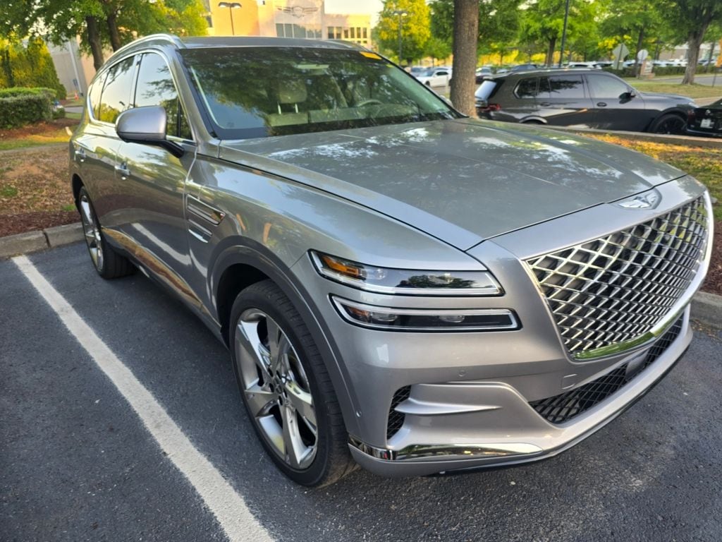The full list of features includes: Prestige Package (12.3" 3D Digital Instrument Cluster, 3-Zone Climate Control, Active Noise Control, Blind-Spot View Monitor, Electronically Controlled Suspension, Ergo Motion Driver Seat, Forward Attention Warning, Head-Up Display, Heated 2nd Row Seats, Leather Seating Surfaces, Monobloc Front Brakes, Panoramic Sunroof, Power Cushion Extension & Bolster, Radio: AM/FM/SiriusXM/HD Lexicon Prem Audio System, Remote Smart Parking Assist, Reverse Parking Collision-Avoidance Assist, Silver Brake Calipers, Surround View Monitor, Ventilated Front Seats, and Wheels: 22" x 9.5J Alloy), 12 Speakers, 4-Wheel Disc Brakes, 4.363 Axle Ratio, ABS brakes, Air Conditioning, Alloy wheels, AM/FM radio: SiriusXM, Android Auto & Apple CarPlay, Anti-whiplash front head restraints, Auto High-beam Headlights, Auto tilt-away steering wheel, Auto-dimming door mirrors, Auto-dimming Rear-View mirror, Auto-leveling suspension, Automatic temperature control, Brake assist, Bumpers: body-color, Compass, Delay-off headlights, Driver door bin, Driver vanity mirror, Dual front impact airbags, Dual front side impact airbags, Electronic Stability Control, Emergency communication system: Genesis Connected Services, Exterior Parking Camera Rear, First Aid Kit, Four wheel independent suspension, Front anti-roll bar, Front Bucket Seats, Front Center Armrest, Front dual zone A/C, Front reading lights, Fully automatic headlights, Garage door transmitter: HomeLink, Genuine wood console insert, Genuine wood dashboard insert, Genuine wood door panel insert, Heated door mirrors, Heated Front Bucket Seats, Heated front seats, Heated steering wheel, Illuminated entry, Knee airbag, Leather steering wheel, Leatherette Seating Surfaces, Low tire pressure warning, Memory seat, Navigation System, Occupant sensing airbag, Outside temperature display, Overhead airbag, Overhead console, Panic alarm, Passenger door bin, Passenger vanity mirror, Power door mirrors, Power driver seat, Power Liftgate, Power passenger seat, Power steering, Power windows, Radio data system, Radio:14.5" Navigation System w/AM/FM/HD Radio, Rain sensing wipers, Rear air conditioning, Rear anti-roll bar, Rear Bumper Applique, Rear reading lights, Rear seat center armrest, Rear side impact airbag, Rear window defroster, Rear window wiper, Remote keyless entry, Roof Rack Cross Bars, Security system, Speed control, Speed-sensing steering, Speed-Sensitive Wipers, Split folding rear seat, Spoiler, Steering wheel memory, Steering wheel mounted audio controls, Tachometer, Telescoping steering wheel, Tilt steering wheel, Traction control, Trip computer, Turn signal indicator mirrors, Variably intermittent wipers, Wheels: 19" x 8.5J Medium Metallic Gray Alloy, and Wheels: 20" x 8.5J Medium Metallic Gray Alloy.