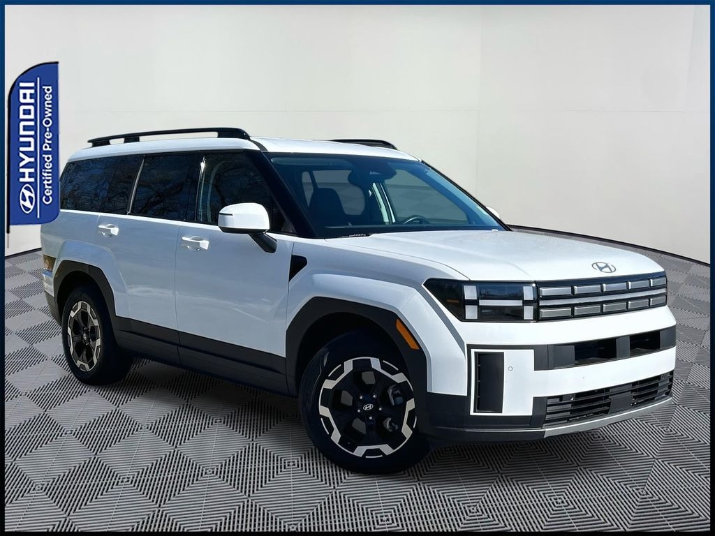 The full list of features includes: Option Group 01, Hyundai Combined Certified, AWD, Black Premium Synthetic, 18" x 7.5J Alloy Wheels, 3rd row seats: bench, 4-Wheel Disc Brakes, 6 Speakers, ABS brakes, Air Conditioning, Alloy wheels, AM/FM radio: SiriusXM, Apple CarPlay & Android Auto, Auto High-beam Headlights, Automatic temperature control, Brake assist, Bumpers: body-color, Cargo Cover, Cargo Net, Cargo Tray, Carpeted Floor Mats, Delay-off headlights, Driver door bin, Driver vanity mirror, Dual front impact airbags, Dual front side impact airbags, Electronic Stability Control, Emergency communication system, Exterior Parking Camera Rear, First Aid Kit, Four wheel independent suspension, Front anti-roll bar, Front Bucket Seats, Front Center Armrest, Front dual zone A/C, Front reading lights, Fully automatic headlights, H-Tex Leatherette Seat Trim, Heated door mirrors, Heated Front Bucket Seats, Heated front seats, Illuminated entry, Knee airbag, Leather steering wheel, Low tire pressure warning, Occupant sensing airbag, Outside temperature display, Overhead airbag, Overhead console, Panic alarm, Passenger door bin, Passenger vanity mirror, Power door mirrors, Power driver seat, Power Liftgate, Power steering, Power windows, Radio: AM/FM/HD Display Audio, Rear anti-roll bar, Rear seat center armrest, Rear side impact airbag, Rear window defroster, Rear window wiper, Remote keyless entry, Security system, Severe Weather Kit, Speed control, Speed-sensing steering, Split folding rear seat, Spoiler, Steering wheel mounted audio controls, Tachometer, Telescoping steering wheel, Tilt steering wheel, Traction control, Trip computer, Turn signal indicator mirrors, and Variably intermittent wipers.
